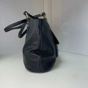 Beautiful and Sophisticated black leather carryall tote by Coach. Features gold hardware and buckle detail. Perfect for everyday use.