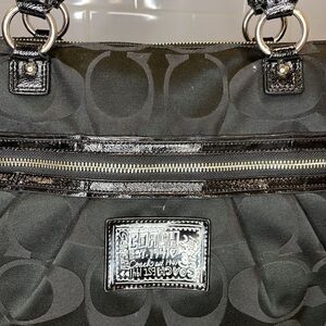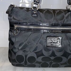 Authentic Coach Daisy Poppy Signature Jacquard Logo XL Tote Shoulder bag in EUC. Black on black signature jacquard C logo covers the XL bag. Silver toned hardware and zippers. Poppy patent leather logo patch on front of bag. Large zipper compartment on front of bag for easy access. Heart zipper pull. Double shoulder straps. Full zipper top protects black sateen interior with 2 slip, 1 pen and 1 zipper compartment for organization. This bag is BIG!! Approximate measurements- 16” across at top, 18” across at widest x 12” x 4”. Double Strap drop - 8” Excellent used condition. Asking $199 on another selling site. Photos are part of the description, zoom to see the detailed condition of this showstopping bag. Feel free to ask questions. NEXT DAY SHIPPING!!