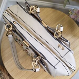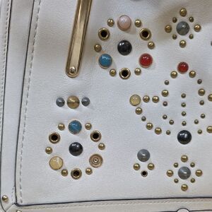 Exterior Detail – Smooth leather accented with a folkloric-inspired motif of colorful cabochons and rivets. Features modern hardware, side snap pockets, double handles with 5 3/4" drop, and a detachable long strap for crossbody or shoulder wear.