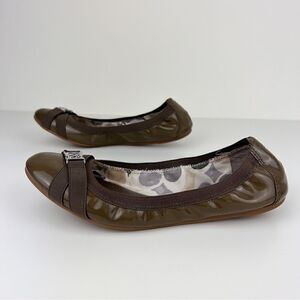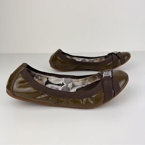 Flexible ballet flats in patent leather with elastic detail and silver logo.