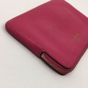 Coach corner zip cross grain leather pink wristlet. Includes original hang tag. Missing wristlet strap. Features gold tone hardware with the coach logo foil embossed on the front of the wristlet. Interior features some signs of use. Corners have some rubbing and color loss. Great usable condition but not perfect. Please see all photos.