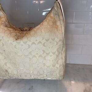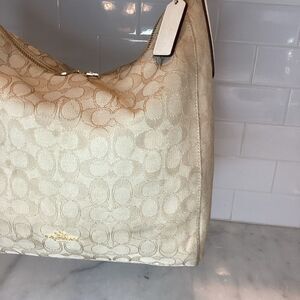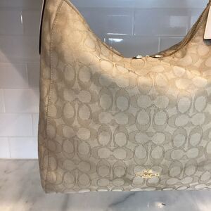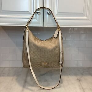 Authentic Coach F58327 Celeste Convertible Hobo/Shoulder/Crossbody Bag in Khaki/Chalk. Elevate your style with the Coach Tan Signature Shoulder Bag. This elegant bag features a classic design, perfect for any occasion. Can be worn as a crossbody or a shoulder bag. This "newer" preloved bag is still listed for $338 on other selling platforms. This bag can hold everything you need, so it's great for travel. Signature coated canvas with leather trim