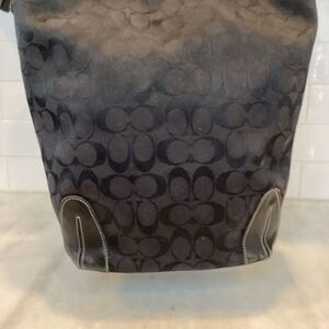 Authentic Coach Jacquard Signature Logo Large Convertible Duffle Bag in preloved condition. The Coach bag identified as model 6083 is described as a Black Large Reversible Buckle Duffle Bag or a Signature Bag Tote Duffle in Black Signature Canvas with Leather Trim. Bucket-style duffle or tote bag.