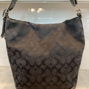 Black signature fabric with black leather trim and bottom. Reversible buckle, adjustable shoulder strap, one large zippered pocket, two smaller patch pockets, and a leather and metal loop for keys inside. Polished nickel/silver. This elegant black designer women's bag is perfect for any occasion. Its sleek design and high-quality materials make it a must-have accessory. Exterior is in great condition, but interior has damage and stains. Bag will be priced accordingly. Dimensions: Approximately 14" high X 14" wide (or 15" wide) and 8" deep. Please review the photos for the best description of this preloved bag. Please ask questions and make an offer.