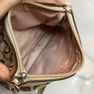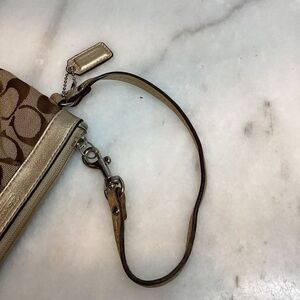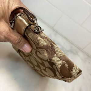 This elegant Coach clutch showcases the iconic brown and gold signature pattern, complemented by gold-tone hardware. Metallic gold leather accents elevates the look of this pleated wristlet. Crafted with attention to detail, it offers a sophisticated touch to any ensemble. Exterior is in excellent used condition. Tan interior with card slot could use a quick cleaning. Photos are the best description of this vintage wristlet. Please ask questions and make an offer.