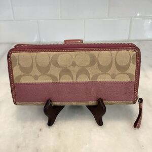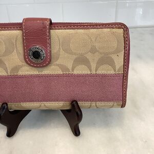 Authentic Coach Jacquard Signature Stripe Logo Full Sized Wallet in EUC. Elegant Coach wallet with signature pattern. Features soft pink/mauve accents and secure closure. Silver hardware with signature snaphead closure. Lots of organizational options. Photos are the best description for this classic vintage Coach wallet. Approx. 7.5" x 3.5" Make an offer!