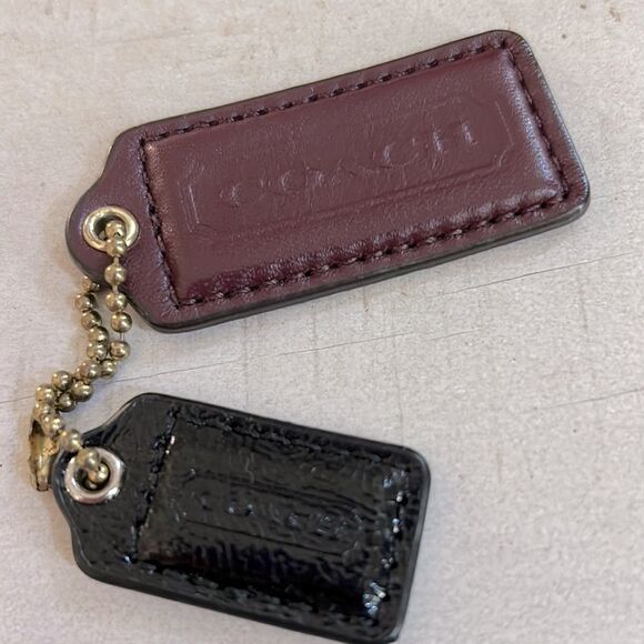 Two coach leather keychain tags. One brown leather and the other dark brown Patent leather.