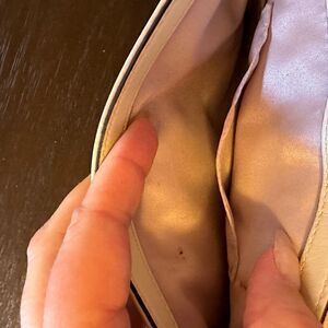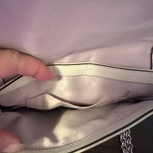 Crossbody with metal chain strap. Silver hardware. Light pink fabric interior with small pocket. Color is cream with gray snakeskin embossed trim. A couple barely noticeable marks shown in the last pictures. Approximate measurements are: