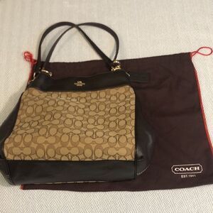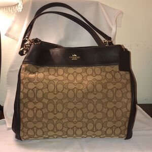 Coach bag, Coach Lexi bag, Authentic Coach bag, Coach bag with center section zipper, Brown Leather/ Signature Jacquard Coach bag,