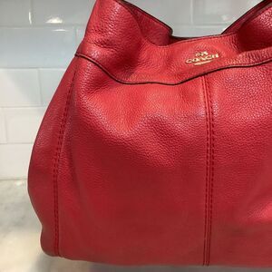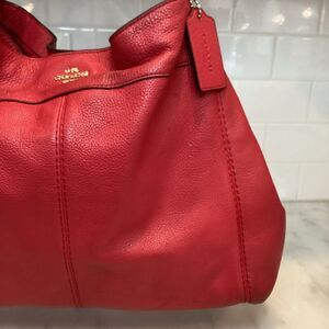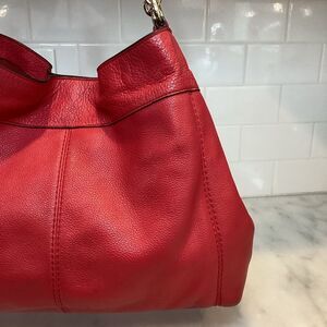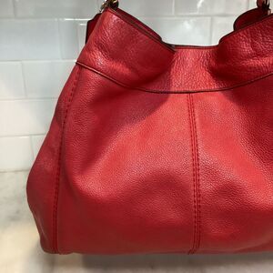 Authentic Coach Large Lexy Pebbled Leather Shoulder Bag is a classic addition to your closet! Amazing Cherry Red color leather and stitching is sure to draw compliments. Gold-tone hardware and matching Coach hang tag. Top magnetic clasp secures spacious interior with 3 separate compartments (2 open, 1 zip). 2 interior slip pockets and 1 interior zip pocket also in a stunning red color. See photos for more detailed description. Please ask questions.