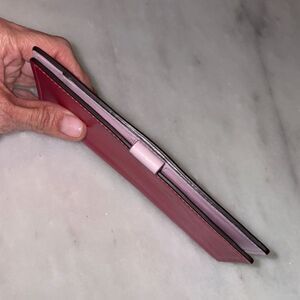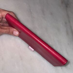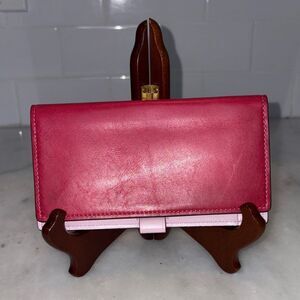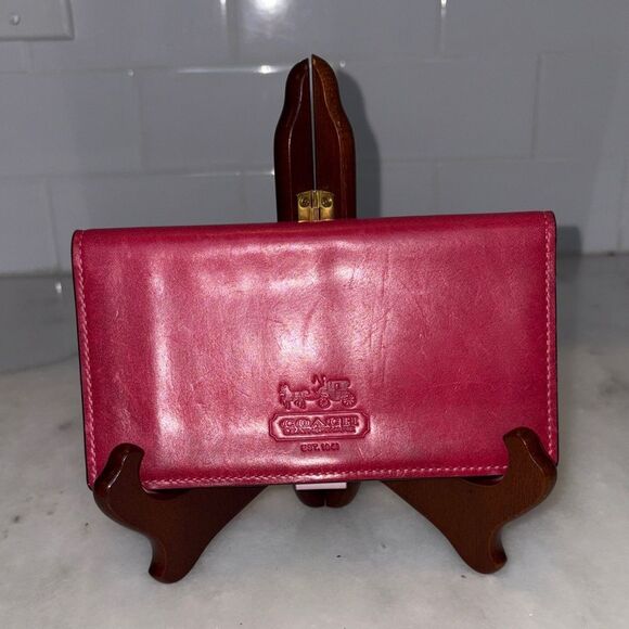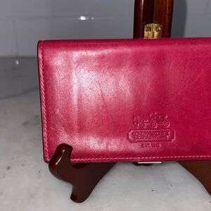 Authentic Coach leather checkbook case wallet is perfect to fit inside many of the wallets inside my closet. There is a beautiful red leather wallet that matches perfectly!! Preowned. Pink stitching on the outside. Interior is smooth pink leather. Coach name embossed into the leather on the front and in gold on the inside. One slip pocket, checkbook pocket and a pen holder. Its elegant design offers both style and functionality. Approximate measurements - 6.5" x 3.5" Photos are the most accurate description of this vintage classic piece. Feel free to ask questions and make an offer!! Next day shipping!