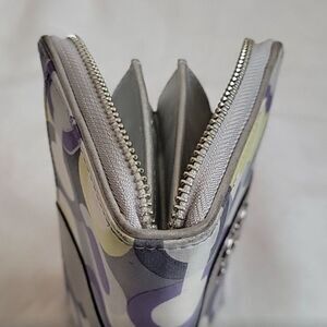 Coach lemonade long wallet is stylish and functional. She has a zipper closure, middle zipper coin pouch, and 12 slots inside. She measures 8” X 4” X 1”