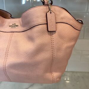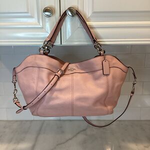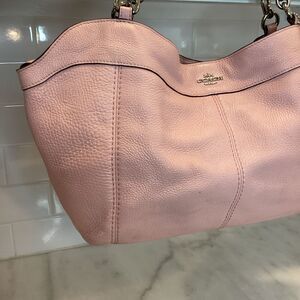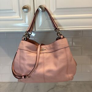 Authentic Coach Lexy Convertible Pebbled Leather Shoulder Bag in EUC. Crafted from refined pebbled leather in a petal pink hue, offering both durability and a luxurious feel. This convertible style can be carried by its double handles with a 5 1/2" drop or worn as a shoulder or crossbody bag using the detachable strap with a 20" drop. Features silver-tone hardware, including chain details on the handles and a Coach hangtag. The bag secures with a snap closure and has a fabric lining. The interior is equipped with a center zip compartment for secure storage, along with inside zip, cell phone, and multifunction pockets for organization. Approximate dimensions are 10 3/4" (L) x 9" (H) x 4 1/4" (W) Photos are the best description of this beauty!! Please ask questions. Make an offer!!