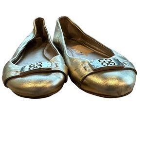 Preloved, no known flaws, see photos for all details. Beautiful leather flat with gold metal detail on toe.