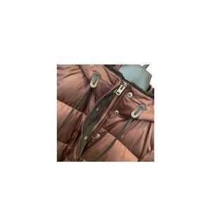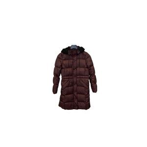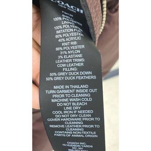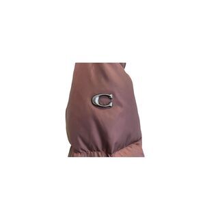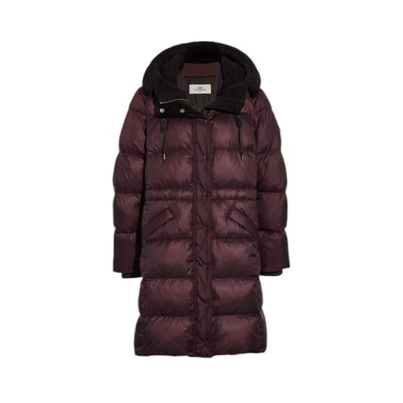 Women's size S long puffer coach jacket with zip and snap closure, slip pockets and faux shearling on hood. Mini logo pendant on left arm area.