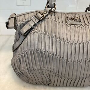 Authentic Coach Madison Sophia in a subtle grey gathered leather satchel. Silver horse & carriage emblem on front with silver hardware accents. Pleated leather in excellent condition makes the bag roomie & expandable. Great hang tags! Full zip top w/royal lavender sateen interior with 2 slip & 1 zip pocket. Detachable shoulder strap included. This elegant Coach satchel in a refined gray shade showcases a structured design with a touch of slouch, perfect for everyday sophistication. The pleated leather texture and silver-tone hardware add a luxurious feel, while the top handles and optional shoulder strap offer versatile carrying options. Photos are part of the description, zoom on photos for detailed condition of the beautiful bag!! One of the most popular Madison Sophia models!! Approx. 14"x10"x3" handle-5.5" Long strap -12” Feel free to ask questions. Make an offer!!