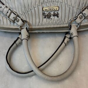 Authentic Coach Madison Sophia in cream colored gathered leather satchel. Silver horse & carriage emblem on front with silver hardware accents. Pleated leather in fair condition makes the bag roomie & expandable. Bottom of the bag and interior needs a quick cleaning, priced accordingly. No hang tags! Full zip top w/soft lavender sateen interior with 2 slip & 1 zip pocket. Detachable shoulder strap included. This elegant Coach satchel showcases a structured design with a touch of slouch, perfect for everyday sophistication. The pleated leather texture and silver-tone hardware add a luxurious feel, while the top handles and optional shoulder strap offer versatile carrying options. Photos are part of the description, zoom on photos for detailed condition of the beautiful bag!! One of the most popular Madison Sophia models!! Approx. 14"x10"x3" handle-5.5" Long strap -12” Feel free to ask questions. Make an offer!!
