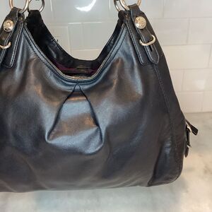 This Coach Maggie Mia Black Leather Hobo Shoulder Bag is a stunning addition to your closet! Elevates any outfit! Leather is extremely soft to the touch! Gorgeous purple satin interior! Beautiful silver hardware! Extremely spacious! 3 separate sections (2 w magnetic clasp, 1 zip)! 4 slip pockets & 1 zip pocket inside! No hang tags. See photos for more detailed description of this timeless, classic beauty!! Please ask questions.