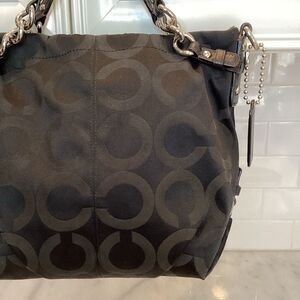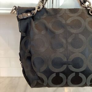 Authentic Coach Op Art Brooke Sateen Convertible Tote Satchel Shoulder Bag in EUC. Coach Brooke Op-Art Black Sateen & Black Leather Bag is Coach style number 14147, made in 2009. The exterior is made of Coach's black Signature jacquard in their Op-Art C black-on-black pattern. Silver-tone hardware. The bag has dual leather handles with chain detailing and a longer shoulder strap. Top-zip closure with oversized leather zipper pull. The interior is oxblood satin and has 2 slip pockets and 1 zipper pocket. Excellent Used Condition. Clean inside and out. No odors and all zippers and hardware function well.
