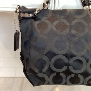 Measures approximately 12" wide x 12" high x 5" deep, with a 4" handle drop and a 9" removable shoulder strap drop. Elevate your style with the elegant Black Coach Signature Tote Bag. Perfect for any occasion, this bag combines luxury and functionality. Listed for $142 on another selling platform. Photos are the best description of this classic beauty!! Please ask questions and make an offer!