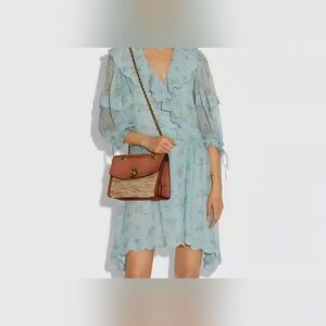 Structured and lightweight, the Parker is a versatile bag that combines uptown elegance with downtown ease. Finished with our Tea Rose turnlock closure, it's crafted in a mix of refined leather and textural woven raffia. Convert the leather chain strap from long to two short handles.