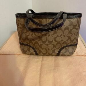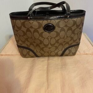 Coach Peyton F47367 Khaki/ Mahagony Coated Canvas trimmed in patent leather tote (minor wear on edges see pictures 3 and 4)