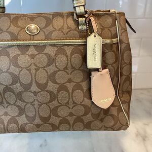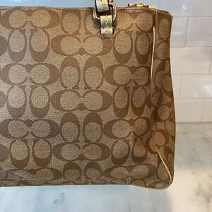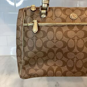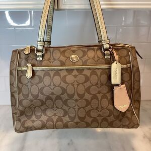 Authentic Coach Peyton Signature Jordan Double Zip Carryall in EUC. Elevate your style with the Coach Brown Signature Tote Bag in signature logo saffiano leather. This elegant bag features a classic design with a spacious interior, perfect for everyday use. The brown color adds a touch of sophistication to any outfit. The handles need a little attention. There are so many compartments in this bag it is perfect for the person who loves to be organized. It is a carryall style with a structured silhouette, featuring double zip compartments and a central snap closure, providing ample storage and organization with interior zip, cell phone, and multifunction pockets. Photos are the best description of this classic bag. Ask questions, make an offer!!