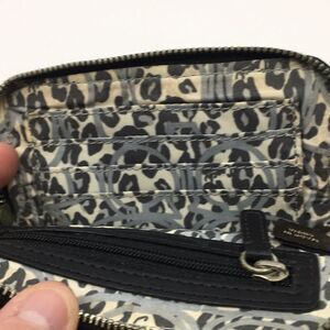 Coach Poppy Y2K square wristlet. Such a fun Coach Poppy SLG! Fun ocelot animal print interior. This is a crinkle patent leather. Zipper was slightly stiff at corners but I have waxed the zipper and it is running smoother. Worth noting but still fully functional. Silver tone hardware. Minor marks on interior but it is minimal and could probably be cleaned up a bit.