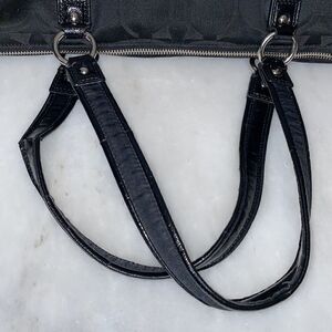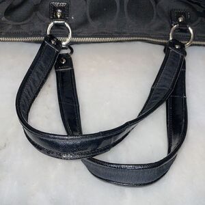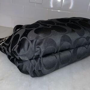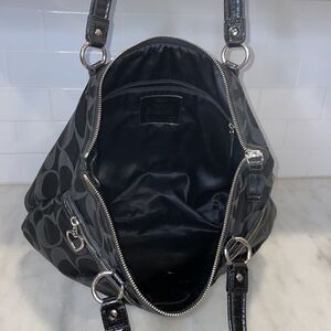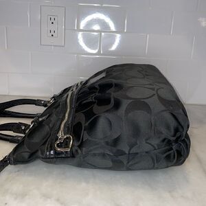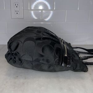 Authentic designer Coach Daisy Poppy Signature Jacquard Logo XL Tote Shoulder bag in EUC. Black on black signature jacquard C logo covers the XL bag. Silver toned hardware and zippers. Poppy patent leather logo patch on front of bag. Large zipper compartment on front of bag for easy access. Heart zipper pull. Double shoulder straps. Full zipper top protects black sateen interior with 2 slip, 1 pen and 1 zipper compartment for organization. This bag is BIG!! Approximate measurements- 16” across at top, 18” across at widest x 12” x 4”. Double Strap drop - 8” Excellent used condition. Asking $199 on another selling site. Photos are part of the description, zoom to see the detailed condition of this showstopping bag. Feel free to ask questions. NEXT DAY SHIPPING!!