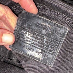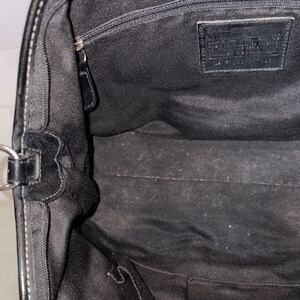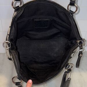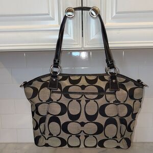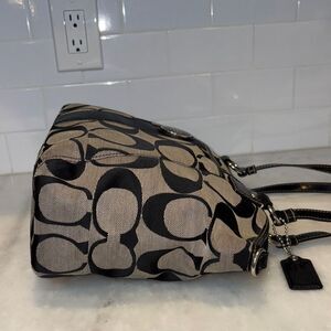 Designer authentic and stylish Coach F17948 Signature Canvas and Patent Leather Satchel Handbag in black and grey offers classic appeal for any occasion, featuring a spacious main compartment with a secure zip-top closure, one interior zippered pocket, two interior slip pockets, and convenient exterior front and back slip pockets for organization, all complemented by polished silver-tone hardware; measuring approximately 15 inches in width, 11 inches in height, 4 inches in depth, with an 8-inch handle drop, this versatile bag is in good pre-owned condition with gentle signs of use, as detailed in the photos, and is being sold without its original long crossbody shoulder strap.