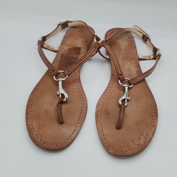 Keywords: Coach sandals, dog leash hardware, brown leather flats, size 10 sandals, summer thong sandals.