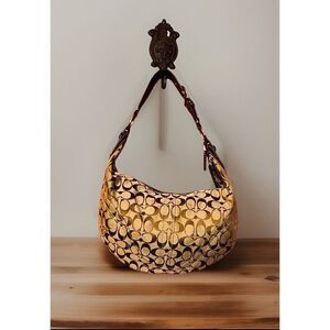 The Coach Signature C Hobo Handbag with Y2K Thick Strap (Model K0632-10075) is a stylish and vintage piece perfect for casual occasions. This medium-sized handbag features a signature C pattern in tan jacquard with a wide brown leather handle/strap. The gold hardware accents add a touch of sophistication to this crescent-shaped bag with a zip closure and a small hangtag. The interior is lined with brown fabric and includes inner pockets including a zippered pocket, making it both fashionable and functional for everyday use. It measures 15”w, 9.5”h and about 8” shoulder drop. This bag is in beautiful clean condition and a perfect addition to your collection.