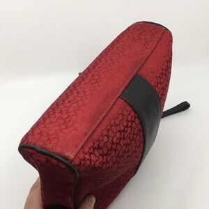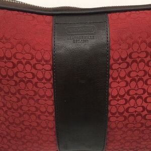 Coach Style 5094 red Signature C jacquard and chocolate brown leather trim pouch. Perfect for makeup for travel. This is a nice large pouch. Could be used for all toiletries, and unisex piece, so the perfect gift for a man who collects Coach too. Would also be perfect to carry as a clutch or tablet case. Measurements are in photos. Some signs of wear as photographed both on the interior and exterior but overall very good used condition, especially that since this piece is from 2006, so almost vintage.