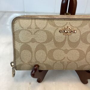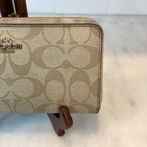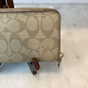 Authentic Coach Signature Continental Leather Full Zip Wallet in EUC. This Coach wallet showcases a timeless cream color with the iconic monogram pattern, complemented by rich gold hardware. Interior leather is smooth tan color. The collection embodies a classic design, perfect for adding a touch of elegance to any ensemble. Crafted with attention to detail, these bags are a testament to Coach's commitment to quality and style. So many compartments, it would be difficult to fill them all. Fabric around the zipper needs an quick, easy clean. Photos provide a full detailed description of this classic Coach wallet. Approximate measurements - 7.5" x 4" Please ask questions and make an offer!!!