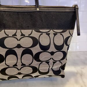 Authentic Coach Signature Jacquard Stripe Zip Top Tote Bag is a classic. Black/Gray signature logo. Silver hardware. Front exterior slip pocket is great for easy access. Zip top keeps your belongings protected. Spacious black interior with 2 slip and 1 zip pocket. Minor imperfections on corners as shown. Zoom on photos for more detailed description. Photos are the best way to see the condition of this classic tote!! Please ask questions.