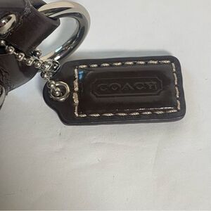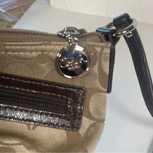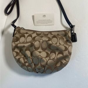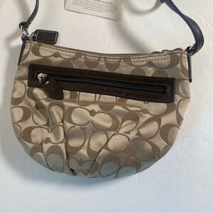 Coach Signature Jaquard Crossbody Purse. Excellent pre-owned condition. Sateen with brown leather trim and strap. Dark satin interior with one zipper pocket. 1 front zipper pocket. Measures approximately 8.5" inches width and 6" inches length with a 22" shoulder drop.
