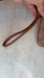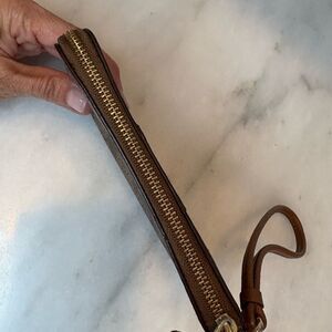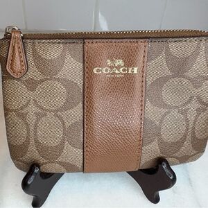 This Coach wristlet clutch showcases a sophisticated brown leather design, featuring the iconic Coach signature pattern. The compact size and convenient wrist strap make it an ideal accessory for both casual outings and formal events.