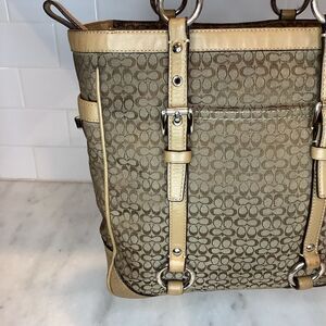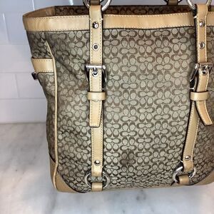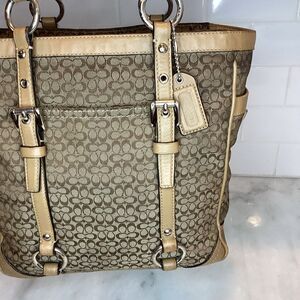 Authentic Coach Jacquard Mini “C” EW Large Gallery Tote Bag is a staple in your closet! Adjustable straps. Silvertone hardware. Mini “C” signature jacquard. Front exterior slip pocket and East West side twist lock slip pockets. Top zip keeps your belongings secure. Full open zipper allows you to put larger items inside. Spacious interior with 2 slip pockets and 1 zip pocket. Approx. Dimensions: 10”x9.5”x3.75” Approx. Adjustable Strap Drop: 9”-11” Photos are part of the description; zoom to see detailed condition of this preloved classic bag. Feel free to ask questions. Make an offer!