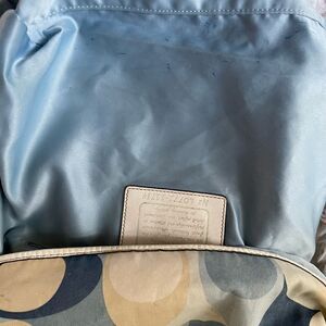 Coach Signature Nylon Blue Scarf Print Hobo Bag 11734 Leather strap and trim.front zipper top zipper the inside lining has a side zipper two side pockets pre owned in good used condition light transfer marks not visible see all pictures any questions please message.M1