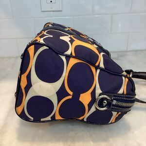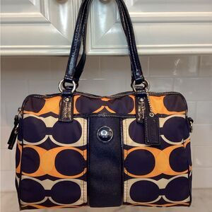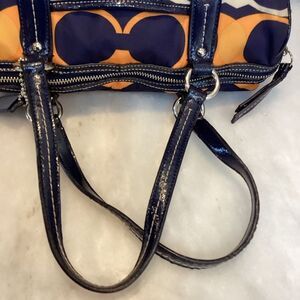 Authentic Pre-Owned Coach Signature Linear Stripe Should Bag in navy, orange and cream signature nylon with navy patent leather trim and silver toned hardware. Looking for the perfect bag to go with your jeans?  This will effortlessly pair with your denim and so much more.  Navy base with pops of color and tons of space make the bag the easy choice for everyday use. Love this bag!!!