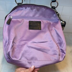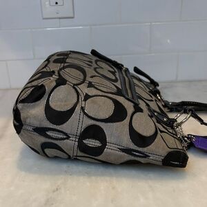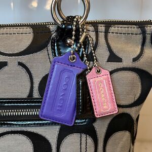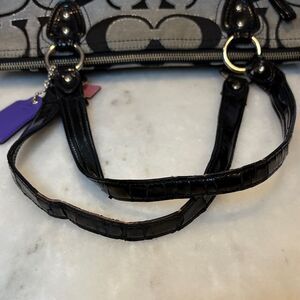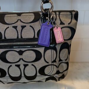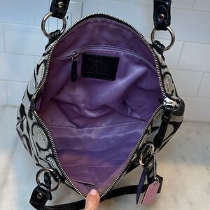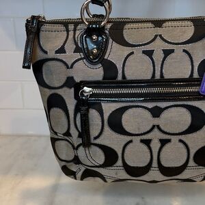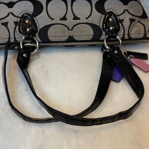 Authentic Coach Gray/black Signature jacquard silver Lurex logo with black patent leather accents and silver hardware. 3 colorful hangtags -Purple Pink and black. One zipper compartment on front exterior. Full zipper top with stunning lilac sateen interior with 1 zip, 2 slip & 1 pen pocket. Interior & bottom needs a good clean. Patent leather handles show cracking and wear, priced accordingly. This bag is large and could fit a small Chromebook. Photos show detailed condition of this great bag!! Approx. 15"x13.5"x4" strap drop- 8" Zoom on photos, ask questions and Make an offer!!