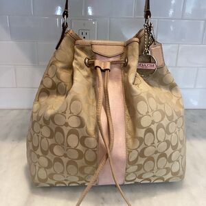 Authentic Coach Signature Stripe Jacquard Drawstring Large Tote Bag in preloved condition. Discover the elegance of the Coach Shoulder Bag, featuring a sophisticated tan and pink color palette. This bag combines the iconic Coach monogram with feminine pink accents, making it a stylish choice for any occasion. Crafted with attention to detail, it offers both functionality and timeless appeal. This is a nice sized bag that can fit a tremendous amount of things. If you are the person who has to hold everyone else's stuff, this is the bag for you. Please look at the photos to see minor flaws in canvas and stitching. Photos are the best description of this classic beauty. Ask questions and make an offer!!