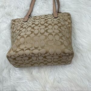 Coach Signature Stripe tote. Khaki signature logo canvas with tan patent trim. Pink stripe. Inside zip, cellphone and multifunctional pockets. Zip-top closure and cream/grey fabric lining. Outside snap pocket. 14” (l) x 8” (h) x 5” (w). 8.25” drop. Black marks down pink stripe, some wear on logos front and back, minor wear on interior.