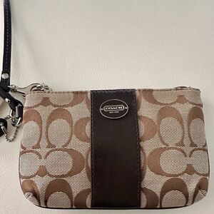 Classic canvas wristlet by Coach with brown leather stripe and wrist band. Front logo plaque with top zip closure and silver hardware. Fabric interior with card slots and plenty of room. Length 4” x Width 6 1/2”. NWT