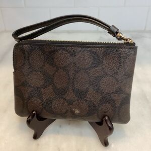 Authentic Coach Small Signature Canvas Corner Zip Wristlet Black/Brown in preloved condition. Elegant Coach wristlet with signature pattern. Features a convenient wrist strap and sleek design. Approx. 6" x 4"