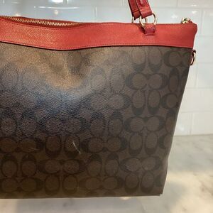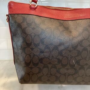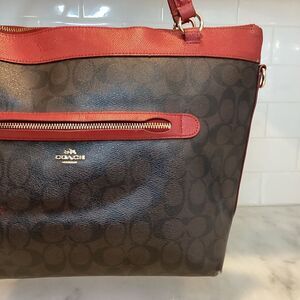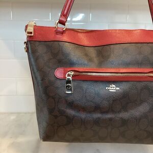 Authentic Coach Tyler Signature Logo Saffiano Leather Tote. Discover the elegance of the Coach Red and Brown Monogram Tote, featuring a signature brown pattern with vibrant red leather accents. This structured tote combines luxury and functionality, making it a timeless addition to any collection. This vintage Coach tote bag combines the iconic brown monogram canvas with bold red leather accents, creating a striking contrast. Handles and corners show some wear. Interior needs a light cleaning of the fabric. Its spacious design and preloved red leather handles make it perfect for everyday use, while the gold-tone Coach horse & carriage logo and zipper adds a touch of elegance. Approximate measurements:11.25 inches x 9.0 inches x 4.75 inches Photos are the best description of this classic high end Coach tote. Please ask questions and make an offer!!