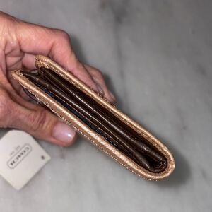 Authentic designer Coach Pearlized Metallic Leather Twistlock Wallet - NWT. Perfect gift! Pebbled leather in a goldish/tan color. Beautiful silver hardware twist lock on the front of the wallet. Main compartment is chocolate brown smooth leather with card slots, ID slot and cash slot. Tons of storage for a compact wallet. Back of the wallet has a zipper compartment. Approximate measurements - 5.25" x 3.5" Photos are the most accurate description of the condition and style of this item. Zoom on the photos and ask questions. Next day shipping!