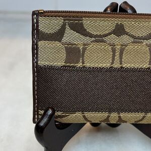 Authentic designer Coach Jacquard Signature Logo Stripe Legacy Sateen Interior Card Holder Wallet in EUC. This elegant clutch features the iconic Coach 'C' monogram pattern in a sophisticated brown and tan colorway. Crafted from durable coated canvas with leather accents, it offers a timeless design perfect for any occasion. The silver-tone hardware adds a touch of luxury to this versatile accessory. Card slots, a zipper compartment, and even an ID slot for easy access, this is your go to classic Coach vintage piece. This piece is an outstanding condition. Photographs are the best description of this item. Please ask questions and make an offer. Approximate measurements - 4.5" x 3"