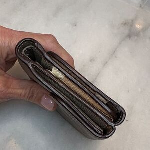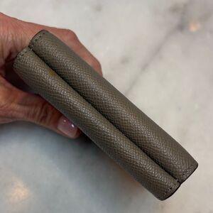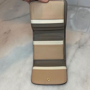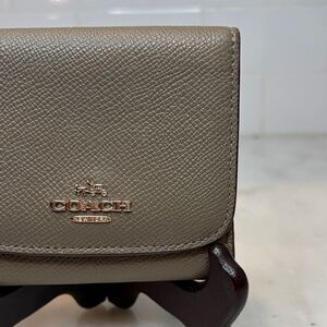 Authentic designer Coach Cross Grained Leather Compact Bifold Wallet in EUC. Gray leather bifold wallet with snap flap in the front and back. Front compartment has stunning three colored leather inside. Card slots and cash slot!! Back compartment is accordion style pocket. Approximate measurements - 4.25" x 3.75" Photos are the most accurate description of the condition and style of this item. Zoom on the photos and ask questions. Next day shipping!