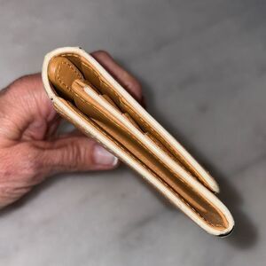 Authentic Coach Vintage Leather Full Sized Bifold Wallet in EUC. The wallet is crafted from tan/light brown leather, characteristic of vintage Coach accessories. It features a classic bifold design, it opens to reveal compartments for cards, cash. The full-sized nature provides ample storage space.